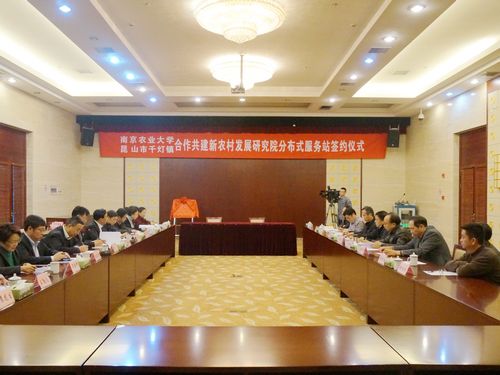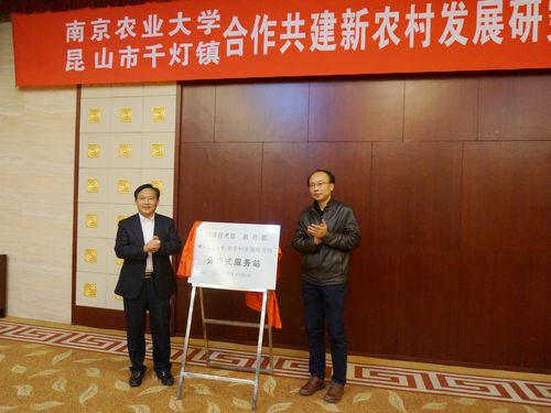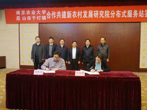 1月9日,万象城awcsport官网与昆山市千灯镇人民政府共建新农村发展研究院分布式服务站签约揭牌仪式在昆山举行。江苏省农业委员会党组书记、主任吴沛良,万象城副校长丁艳锋,昆山市委副书记张月林、市委常委周伟、副市长汤土云、陈修文等出席仪式。仪式由昆山市千灯镇党委书记李文主持。