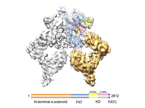ATM/Tel1激酶负责启动细胞对DNA双链断裂损伤的响应,可以直接磷酸化细胞内超过1000个重要底物。解析ATM/Tel1激酶的三维结构,可以帮助理解ATM/Tel1激酶活性调控的分子机制。肿瘤放疗由于其对正常组织细胞的损伤仍极大限制了其实际应用,通过选择性增强肿瘤细胞对放疗的敏感性,可以显著增强放疗的效果。近年来,ATM/Tel1抑制剂已被作为肿瘤放疗增敏剂在进行研究,因此本研究报道的8.7 Å的完整的ATM/Tel1激酶的电镜结构,不仅具有阐明基因组稳定性调控的重大科学意义,而且将对肿瘤放射治疗的新型增敏剂的研发起到重要的指导作用。