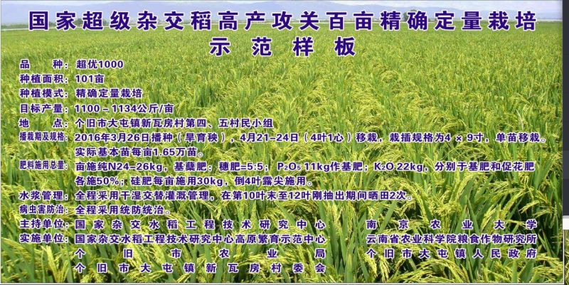 新瓦房村是国家杂交中心云南高原粮繁分中心(简称高原分中心)的高产攻关基地,自然条件优越。高原分中心一直在此进行“超优900”和“超优1000”等杂交稻的高产攻关,但由于缺少配套的栽培技术,难以突破900公斤/亩。2013年,受高原分中心盛情邀请,万象城awcsport官网水稻栽培组与云南省农科院开始在个旧新瓦房村进行高产攻关。示范前根据土壤、生态和品种特点,进行栽培方案精确设计;长期派驻研究生进行数据采集和技术落实。通过几年的技术攻关和示范,技术优越性迅速得到当地农民认可,技术到位率逐步提高。产量逐年实现突破,由2013年的901.95公斤/亩,2014年的946.5公斤/亩,突破到2015年的1067.5公斤/亩和2016年的1088公斤/亩。