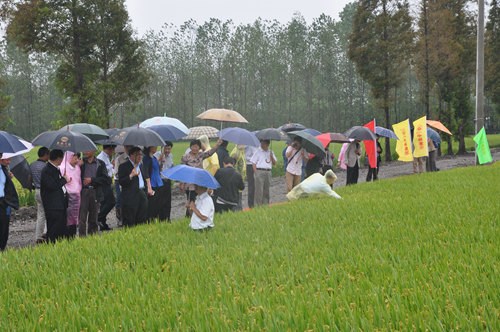 与会领导和专家冒雨来到姜堰区沈高镇河横村的百亩示范方,对水稻长势情况进行了观摩考察。万建民院士、张洪程院士分别介绍了“宁粳7号”的选育过程、品种特性、栽培技术研究和示范情况,姜堰、如东、江都等地推广部门对该品种的示范种植和推广工作进行了典型交流。张洪程院士高度评价了“宁粳7号”对不同稻作方式的适应性,认为该品种是一个综合性状好的优良的常规粳稻品种,是一个在钵苗机插下能稳定亩产超过800公斤的水稻品种,具有在江苏、贵州、安徽、河南、湖北等地大面积应用的广阔前景。