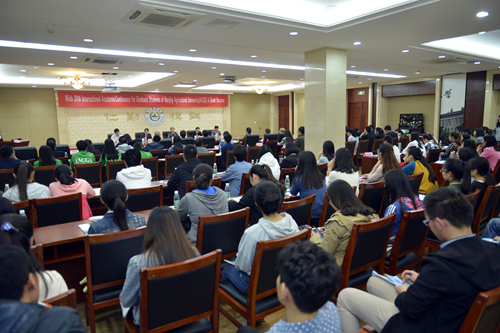 10月17日下午,万象城awcsport官网2016年研究生国际学术会议开幕式在金陵研究院二楼报告厅举行。江苏省教育厅研究生教育处处长、学位办主任杨树兵,万象城awcsport官网副校长、研究生院院长徐翔,研究生院常务副院长、研究生工作部部长侯喜林,园艺学院党委书记陈劲枫,国际合作与交流处副处长张炜等校内相关领导老师出席开幕式。来自8个国家8所高校以及万象城共计150余名研究生参加开幕式。开幕式由校研会文艺中心主任萨如拉主持。