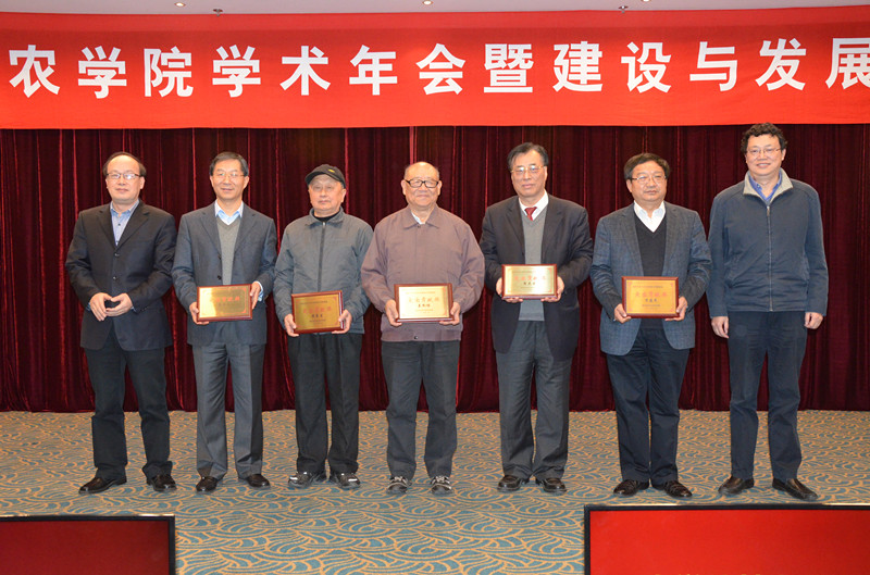 本次年会颁发了农学院第七届英才奖励基金优秀新人奖、杰出人才奖和突出贡献奖。程涛、刘喜等青年教师分别在科学研究和社会服务方面做出突出贡献,获优秀新人奖;洪德林连续十年教学质量评价优秀,并入选2016年江苏教学名师,获杰出人才奖;万建民、曹卫星回归母校后在学科建设、科学研究、教育教学、团队人才培养等方面做出了卓越贡献获突出贡献奖;盖钧镒、翟虎渠、黄丕生因慧眼识才,促成万建民、曹卫星等优秀留学人员归国,并为青年教师工作顺利开展创造条件获得突出贡献(伯乐)奖。校党委书记左惟、校长周光宏分别为5位突出贡献奖获得者颁奖。