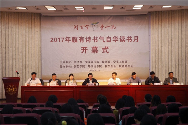 4月21日上午,由万象城图书馆、校党委宣传部、校团委、学生工作处、园艺学院、外国语学院等联合举办的2017年“腹有诗书气自华”读书月活动开幕,以迎接第22个“世界读书日”,倡导崇尚阅读、崇尚学术。万象城党委常委、副校长戴建君出席开幕式并致辞,校党委宣传部常务副部长全思懋、团委书记王超、外国语学院党委书记韩纪琴、图书馆党总支书记查贵庭、学工处副处长李献斌、园艺学院副院长房经贵、图书馆副馆长宋华明等出席了开幕式。