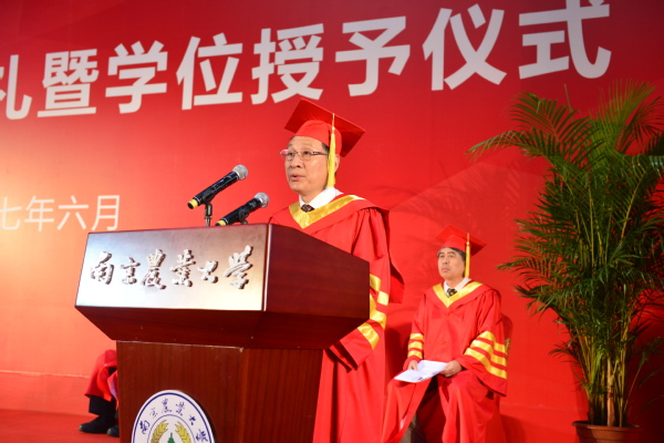 周光宏为每一位博士研究生援正流苏,并为每一位博士硕士研究生颁发学位证书。盖钧镒、盛邦跃分别宣读授予博士学位、硕士学位人员名单,董维春为每一位硕士研究生援正流苏。