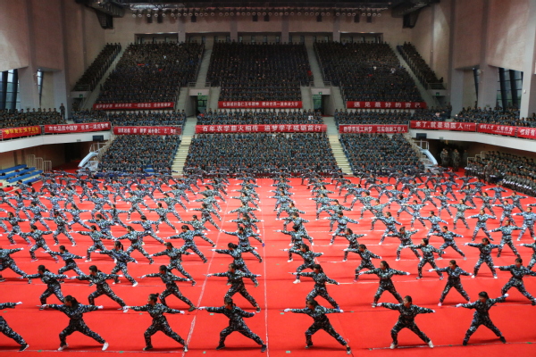 军训成果汇报表演在雄壮的国歌声中拉开帷幕。经过层层选拔出来的各连队精英为现场观众带来精彩的表演,杀气震天的男生刺杀操、干净利落的女生匕首操、技能高超的教官技战术表演,大家规范的动作、磅礴的气势,敏捷的身手、过硬的技能,博得了现场观众阵阵雷鸣般的掌声。