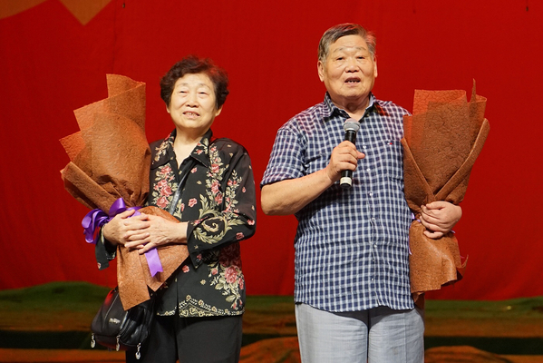 9月27日公演现场,年逾八旬的吕士恒老先生偕夫人回到母校,亲临现场观看话剧,并接受了观众的鲜花。