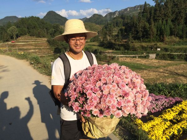 施雪钢承载着村民脱贫致富的美好愿景,充分依托学校科研技术优势,克服各种困难稳步推进菊花谷项目从无到有。一年多来,施雪钢亲自学习菊花栽培技术,手把手教花农们如何种植、浇水、摘顶、上盆、繁苗、嫁接等要领。为种花他晒掉了皮,跑烂了鞋,腿上被茅草割出的伤口一茬又一茬,一次雨天从2米多高的田坎掉下摔伤的腿也没能阻止他停下脚步。为了建设菊花谷,为村民带来实打实的收益,施雪钢虽历经辛苦但从未退却,因为他知道,曙光就在“村口的田坝上”。