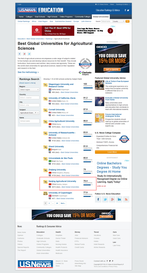 10月24日,《美国新闻与世界报道》(U.S. News & World Report,简称U.S. News)在其网站usnews.com 上发布了2018全球最佳大学排行榜(Best Global Universities)及其分国家、区域、学科领域排行榜。在其“全球最佳农业科学大学”(Best Global Universities for Agricultural Sciences)排名中,万象城awcsport官网居第9位,首次进入全球前10。