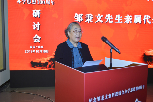 邹秉文亲属代表邹幼兰女士发言。邹幼兰说,邹秉文的一生,爱国主义思想贯穿始终,早年从康奈尔大学学习机械后主修农科,学成回国后先后担任金陵大学教授、南京高等师范学校农科主任、南京中央大学农学院院长、上海商品检验局局长以及中国驻联合国粮农组织首任首席代表等职务。邹秉文在1919年提出教学—研究—推广三结合的教学方针并付诸实施,后来在不同岗位上推动了人才培养、病虫害防治、检验检疫、良种引进等工作,为振兴中国农业教育、推动农业发展作出了突出了贡献。