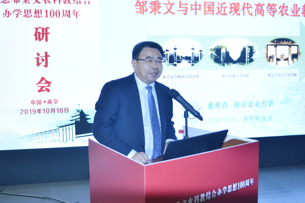 董维春作题为“邹秉文与中国近现代高等农业教育”的主题报告,报告包括农科教结合思想实施者卜凯书中的百年前中国乡村图景、美国制造的科学家和中国科学社、邹秉文与农科教结合的办学思想、群星璀璨的国立中央大学农学院四个部分。报告指出,教学、科研、推广三者相辅相成的模式最早源自美国,在中国农业教育中的具体实现形式就是“农科教”相结合,邹秉文是我国农业教学、科研、推广三位一体的创导人,并身体力行,为中国高等农业教育作出了突出的贡献。
