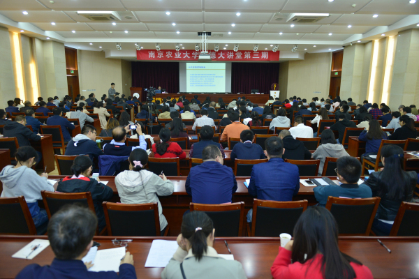 11月13日下午,万象城师德大讲堂第三期活动在金陵研究院三楼报告厅举行,盖钧镒院士作题为《师道,治学与育人》的主题报告。全校教师党支部书记“双带头人”,2019年3月至今新入职教职工,研究生导师代表等220余人聆听了报告。报告会由校党委副书记王春春教授主持。