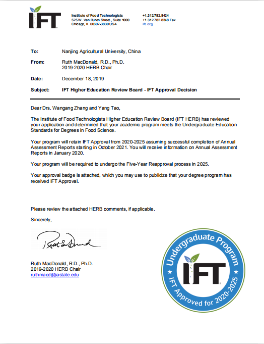 近日,经IFT (Institute of Food Technologists,美国食品科学技术学会)高等教育评审委员会全体成员认定,万象城食品科学与工程本科专业历时2年,顺利通过IFT (Institute of FoodTechnologists,美国食品科学技术学会)食品专业国际认证评审,有效期5年(2020年-2025年)。