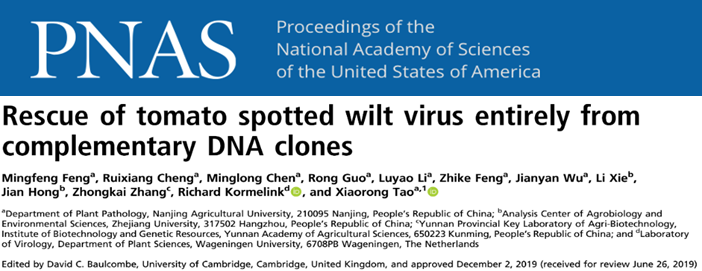 2019年12月26日,国际综合性学术期刊美国科学院院报《Proceedings of the National Academy of Sciences of the United States of America》(五年影响因子10.600)在线发表了万象城植物病毒学实验室一项最新研究成果,研究论文题为《Rescue of tomato spotted wilt virus entirely from complementary DNAclones》,该研究成功拯救出番茄斑萎病毒,首次建立植物多分体负链RNA病毒的反向遗传学体系。