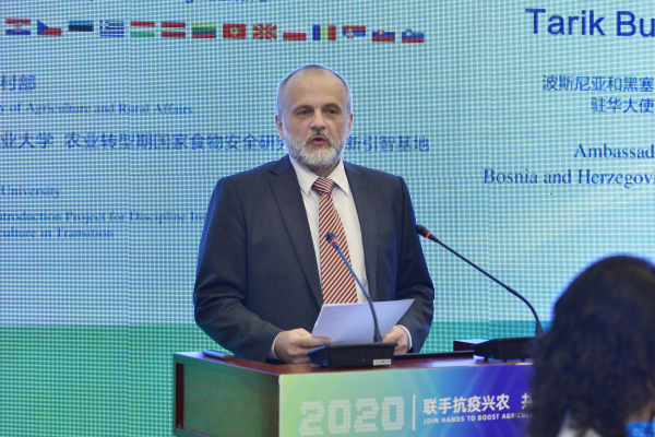 保加利亚驻华大使波罗扎诺夫代表中东欧国家驻华使节致辞,希腊、匈牙利等国农业部长发来视频致辞。