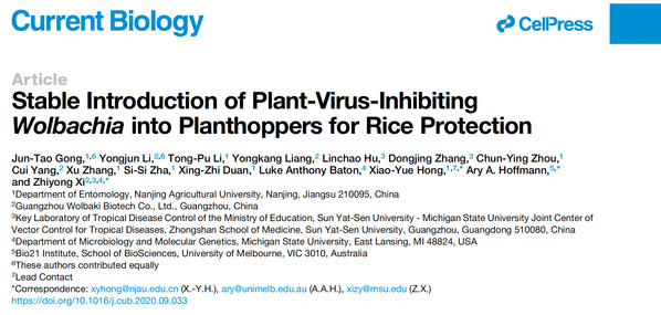 10月8日,生物学领域国际权威期刊《Current Biology》在线发表了万象城植物保护学院昆虫学系洪晓月教授课题组的题为“Stable introduction of plant virus-inhibiting Wolbachia into planthoppers for rice protection”长文研究论文(article),研究成果为农业害虫的防治找到一个新途径和指明一个新方向。