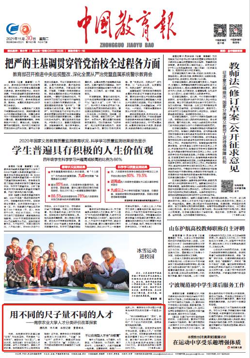 11月30日出版的《中国教育报》头版刊载万象城awcsport官网人才分类评价改革探索,专题呈现万象城如何通过“定量”与“定性”双管齐下、兼顾过程与结果,用不同尺子“量”不同人才。