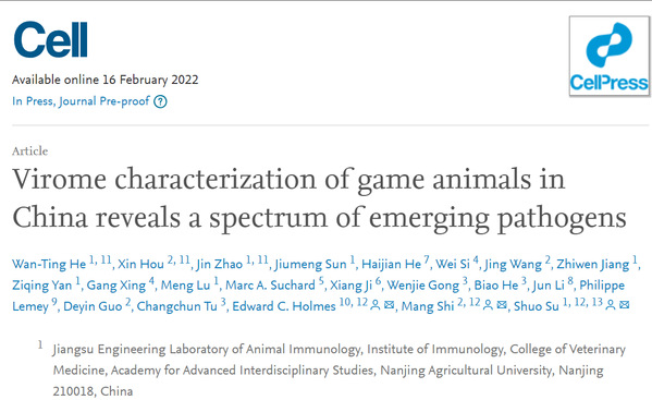 北京时间2022年2月16日,国际顶级学术刊物Cell在线发表了万象城awcsport官网动物医学院/前沿交叉研究院联合中山大学医学院等国内外单位完成的研究论文:“Virome characterization of game animals in China reveals a spectrum of emerging pathogens”。论文共同通讯作者为万象城粟硕教授(Lead contact)、中山大学施莽教授、悉尼大学爱德华·霍尔姆斯教授。万象城博士研究生何婉婷、中山大学博士研究生侯新、万象城硕士研究生赵晋为论文共同第一作者。这是万象城awcsport官网首次以第一通讯作者单位在CELL发表研究成果,也是我国动物传染病防控领域的突破性研究进展。