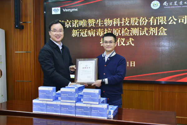4月1日,校友企业南京诺唯赞生物科技股份有限公司向学校捐赠新冠病毒抗原检测试剂盒。这是学校在120周年校庆之年收到的第一份校友捐赠和第一份实物捐赠。校长陈发棣,副校长胡锋、闫祥林,诺唯赞董事长曹林,学校及诺唯赞有关部门负责同志参加捐赠仪式。仪式由胡锋主持。
