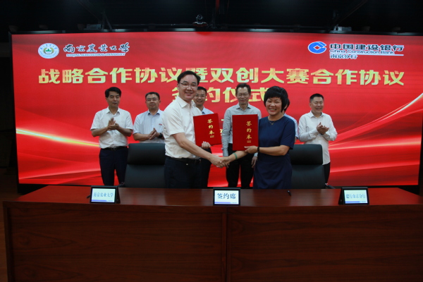 董维春与中国建设银行南京分行行长王芳签署双创大赛合作协议。
