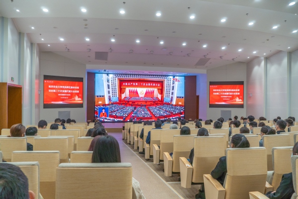 全体校领导、校党委委员、校纪委委员、卫岗校区中层干部、民主党派代表、离退休教师代表在金陵研究院三楼报告厅集中收看大会直播
