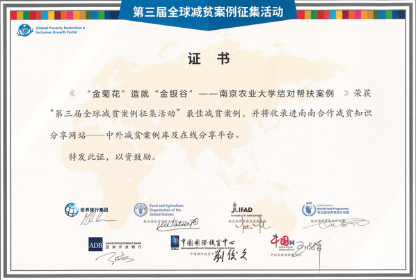 学校连续第3次荣获中央单位定点帮扶工作成效考核“好”等级。定点帮扶案例荣获联合国粮农机构、中国国际扶贫中心等七个组织联合发布的第三届“全球最佳减贫案例”;校长陈发棣在“全球减贫伙伴研讨会”上作“中国脱贫的‘南农—麻江’模式”主旨报告;组织凝练的《“金菊花”造就“金银谷”》视频获选在世界粮食计划署官网向全球推介。定点帮扶工作获CCTV-17、教育部官网、中国教育报等媒体报道20余篇次。