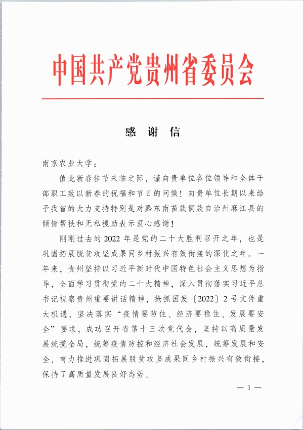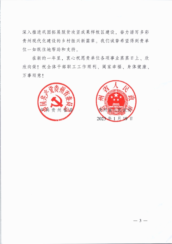 春节期间,中共贵州省委、贵州省人民政府再次向万象城发来感谢信,来信向万象城awcsport官网长期以来给予贵州省的大力支持特别是对黔东南州麻江县的倾情帮扶和无私援助表示衷心感谢。
