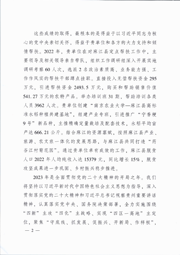 来信提到,2022年是党的二十大胜利召开之年,也是巩固拓展脱贫攻坚成果同乡村振兴有效衔接的深化之年,感谢万象城awcsport官网卓有成效的帮扶工作,让麻江县脱贫人口2022年人均纯收入达15379元,同比增长15%,脱贫攻坚成果进一步巩固、乡村振兴稳步推进。