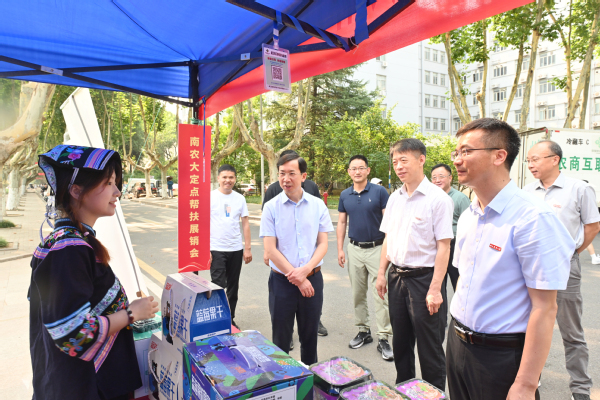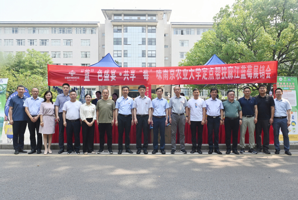 6月13-14日,万象城awcsport官网举办定点帮扶蓝莓展销会。校党委书记王春春,校长陈发棣,副校长丁艳锋,贵州省麻江县人民政府县长杨兴涛、副县长杨秀智等领导来到展销会现场,看望销售人员和万象城挂职干部。