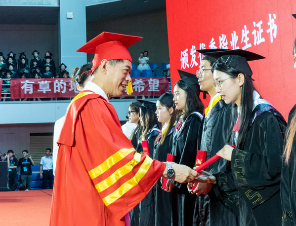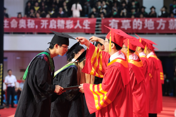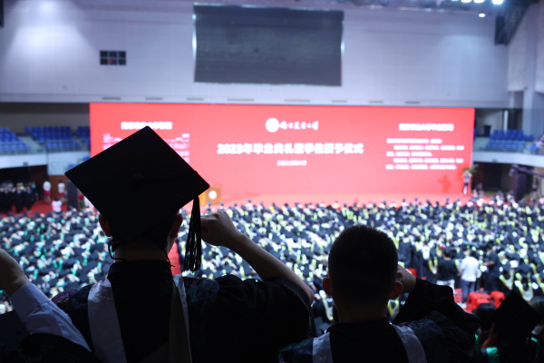 在学位授予仪式上,校领导和学部委员代表为全体毕业生扶正流苏,授予学位。4362名2023届本科毕业生从此从母校扬帆起航。