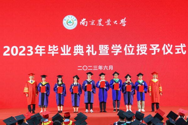 王春春和参加典礼的校领导为硕士毕业生扶正流苏,并授予学位证书。陈发棣逐一为博士学位获得者颁发学位证书。丁艳锋、董维春分别宣读授予博士和硕士学位人员名单。