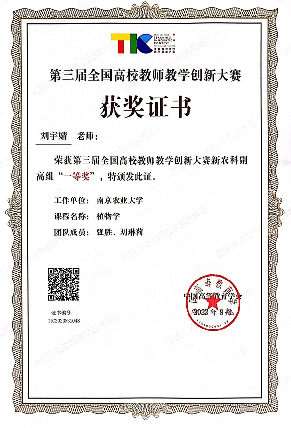 刘宇婧副教授团队主讲的《植物学》是面向生命科学领域专业大一学生开设的一门专业必修课。在本次大赛中,她全面阐述了三代人在《植物学》教学过程中 “从‘心’出发,打造沉浸式高效课堂”的教学创新成果。通过贯彻以学生发展为中心的教学理念,顺应新农科发展趋势和要求,从教学内容、教学资源、教学方式、教学评价等方面进行改革实践,构建了“生临其境、植入人心、物我相融,知行合一”沉浸式高效课堂的探索过程和取得的成果,现场汇报全面系统,有理有据,深入浅出,获得评委的一致好评。植物学课程教学团队在国家教学名师强胜教授带领下,长期坚持课程现代化建设,引领课程教学模式改革方向,先后获得首批国家精品课程、国家精品资源共享课程、国家线上和线上线下一流课程、国家课程思政示范课程,课程建设和改革成果先后获国家教学成果二等奖、省特一等奖3项,主编的植物学教材获首批国家优秀教材二等奖。此次获奖也是该课程不断加强团队建设的具体体现。