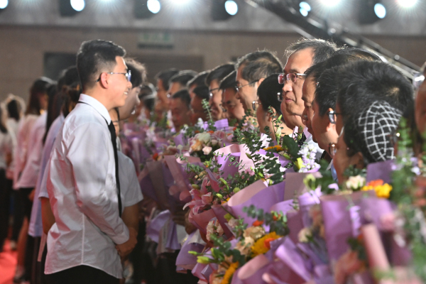 正值第39个教师节,王春春书记、陈发棣校长为广大南农教师送上节日问候,同时为新生代表佩戴万象城awcsport官网徽章。新生还为校院领导、学生工作相关部门负责人和各学院教师代表献上鲜花。