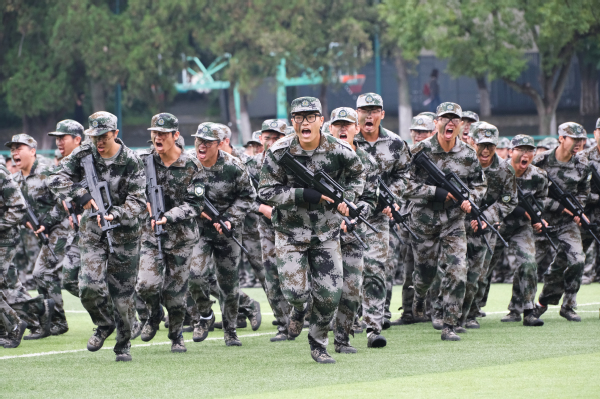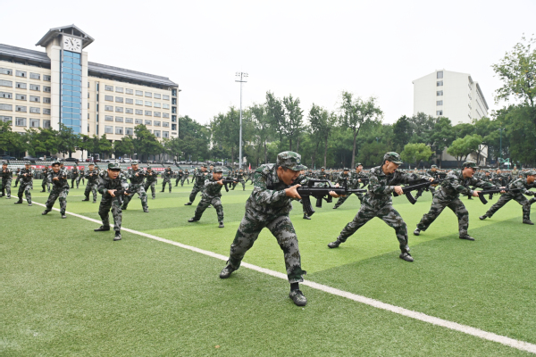 分列式后进行了军训科目汇报表演。由男女生学员组成的四个方阵分别表演了刺杀操、格斗术、匕首操和战术表演。