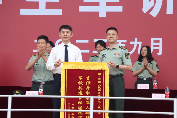王春春、党委办公室主任朱筱玉分别代表学校向承训部队陆军工程大学赠送锦旗。