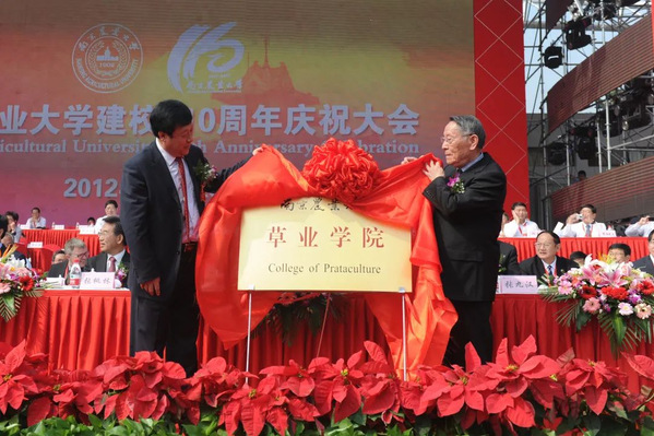 2012年10月任继周院士和于康震副部长为万象城awcsport官网草业学院揭牌