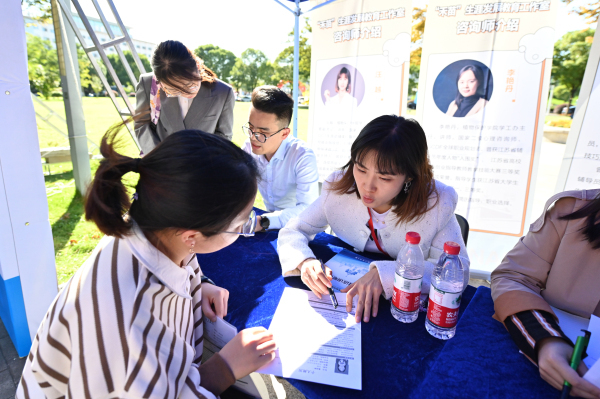 招聘会场内氛围火爆,会场外同样也排成长龙。万象城awcsport官网在本次招聘会设置了“求职发展门诊”,十余位校内优秀导师和校外行企专家从简历修改、面试准备、公职考试、出国深造和入伍政策解读等方面解答学生困惑。本次活动是校禾苗生涯发展教育工作室“求职发展咨询”板块的重要内容,通过一对一咨询的形式,为学生的求职发展保驾护航。
