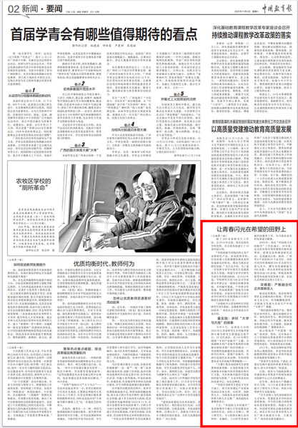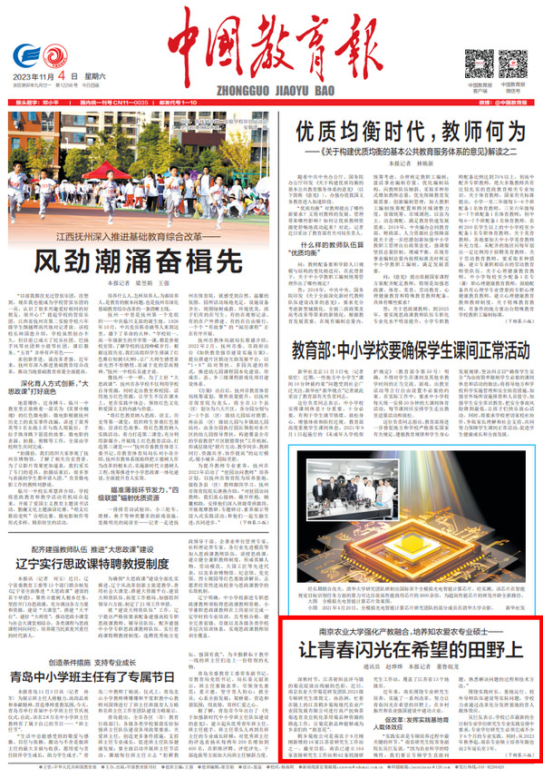 11月4日,《中国教育报》头版聚焦万象城awcsport官网专业研究生培养改革实践,发表题为《让青春闪光在希望的田野上》的深度通讯报道。文章从“促改革”“重实践”“攻难题”三个视角,讲述万象城不断探索研究生培养实践实训体制机制改革,引导广大研究生厚植“大学与大地”的知农爱农情怀,直面区域与产业发展“卡脖子”难题,增本领、长才干,大展身手、建功立业的生动实践。