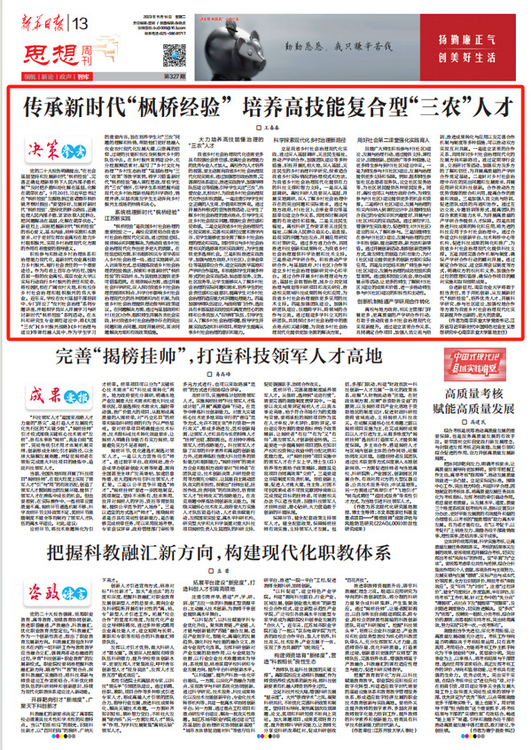 编者按:11月14日,《新华日报》思想周刊“智库”头条刊发万象城党委书记王春春署名文章《传承新时代“枫桥经验” 培养高技能复合型“三农”人才》。文章深刻把握新时代“枫桥经验”的核心要义、基本内涵、精神实质和本质要求,从发展新时代“枫桥经验”、培养优秀人才、开展科学研究、参与社区建设、加强校地合作等方面入手,全面展现了万象城围绕提升全省乡村社会治理现代化水平,助力乡村振兴所开展的特色工作和亮点成效。