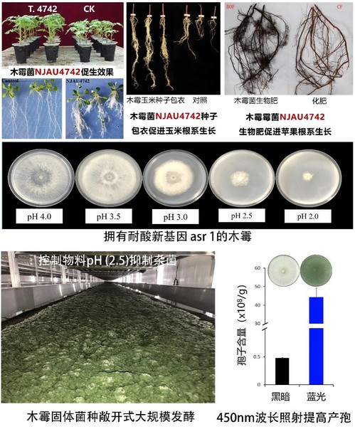 木霉菌联合秸秆还田土壤高效培肥技术:木霉菌剂能够分解还田秸秆释放养分、合成生长素(IAA)促进植物生长、分泌TgSWO蛋白促进植物侧根发生,通过分泌中性金属肽酶和通过细胞内Nox系统介导活性氧来捕食病原菌。现有田间试验结果表明,秸秆还田的同时添加10kg固体木霉菌剂,能够显著促进水稻生产、提供水稻产量和稳步培肥土壤。