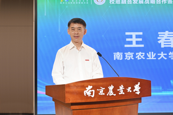 王春春对南京市和江北新区长期以来对万象城事业发展给予的关心指导表示感谢。他指出,南农和江北新区的战略合作,是共同贯彻习近平总书记有关重要讲话和重要论述精神,共同面对新时代新发展的深度回应,是切实把合作系统化、实效化的战略选择。要聚焦人才培养,合力培育一种“新模式”,共同培养更多的知农爱农新型人才,引导更多青年人才来到新区、融入新区、扎根新区。要聚焦科技创新,合力打造一个“新引擎”,以大平台大团队孕育大成果,助力江北新区在江苏发展新质生产力的火热实践中勇当排头兵。要聚焦校地融合,合力探索一条“新路径”,有力推动滨江校区二期工程和教师公寓建设,让江北新区发展成果惠及南农师生;培育一批校地合作标杆,让南农建设成效辐射江北新区。