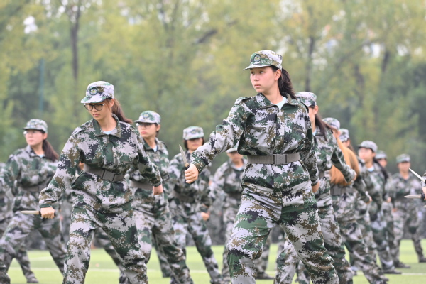 分列式后进行了军训科目汇报表演。由男女生学员组成的6个方阵分别表演了匕首操、格斗术、军体拳和刺杀操。