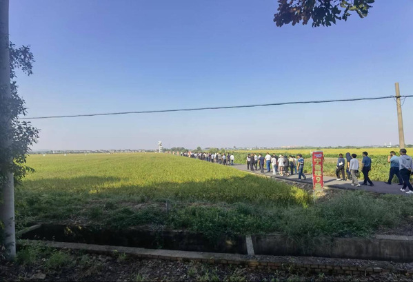 培训会开始前,参会人员来到溧阳市埭头镇葫芦村农业产业园,观摩“宁香粳9号”种植田。2024年,溧阳市农业农村局在埭头镇前六村进行了优质食味水稻新品种“宁香粳9号”示范种植,连片种植1000亩。目前,“宁香粳9号”示范区水稻正处于灌浆至乳熟期,理论产量预估 825公斤。来到示范种植田,一眼望去,千亩稻田丰收在望,植株清秀挺拔,叶姿优雅。万象城awcsport官网江玲教授深入田间后脱口而出“非常震撼”。