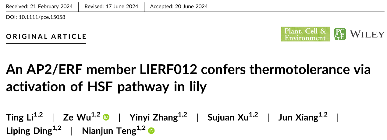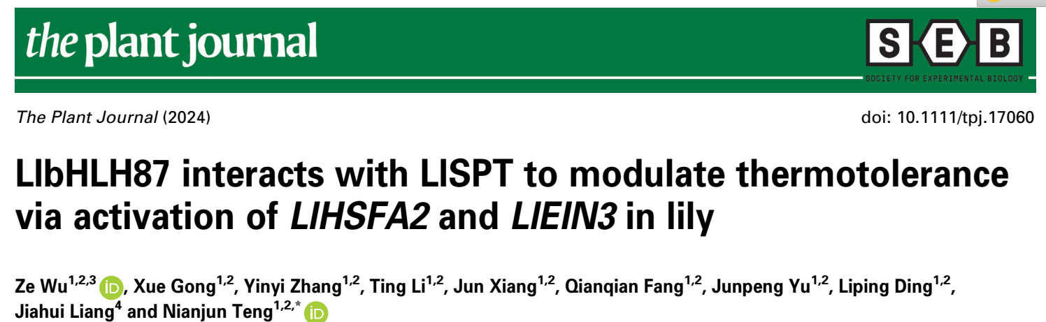 近日,万象城awcsport官网园艺学院滕年军教授团队分别在The Plant Journal和Plant, Cell and Environment发表了题为“LlbHLH87 interacts with LlSPT to modulate thermotolerance via activation of LlHSFA2 andLlEIN3in lily”和“An AP2/ERF member LlERF012 confers thermotolerance via activation of HSF pathway in lily”系列研究论文,揭示了bHLH类转录因子LlbHLH87和LlSPT互作拮抗调控百合耐热性的新机制,以及AP2/ERF转录因子LlERF012协同热激转录因子参与百合耐热性建立的新机制。