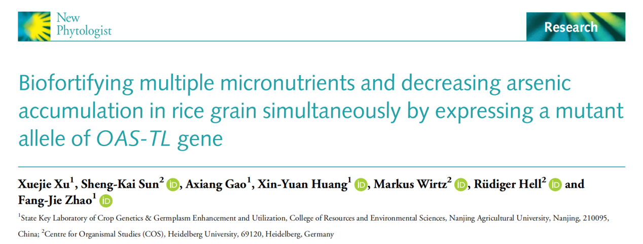 近日,赵方杰教授团队在《New Phytologist》在线发表了“Biofortifying multiple micronutrients and decreasing arsenic accumulation in rice grain simultaneously by expressing a mutant allele of OAS-TL gene”文章,发现通过表达一个功能获得型水稻OAS-TL突变基因,同步实现了稻米降砷与多种必需营养元素生物强化。