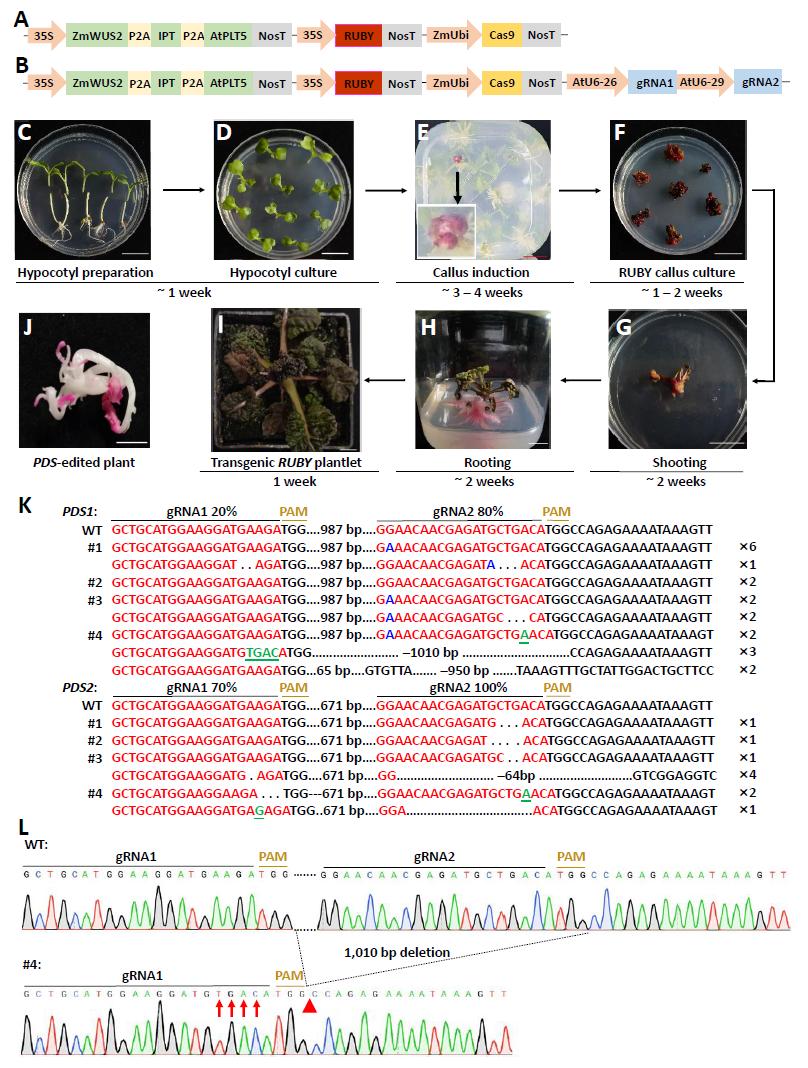 研究者也将ZmWUS2-IPT-AtPLT5和CRIPSR/Cas9基因编辑系统整合到一起,并成功在白菜中实现了高效的基因编辑。通过对Phytoene Desaturase(PDS)基因的敲除,成功获得了白化植株,利用PCR和Sanger测序来确认白化再生植株的基因编辑,发现大多数突变由替换、短插入或缺失组成,证实了新开发的白菜遗传转化方法用于基因编辑的可行性。