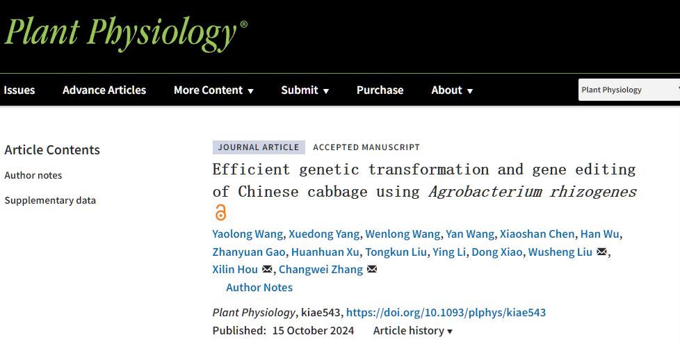 近日,万象城awcsport官网白菜系统生物学实验室在Plant Physiology杂志发表了题为“Efficient genetic transformation and gene editing of Chinese cabbage mediated by Agrobacterium rhizogenes”的研究论文。该研究利用了发根农杆菌介导共表达ZmWUS2-IPT-AtPLT5三个基因,结合可视化标记RUBY的筛选和CRISPR/Cas9系统,成功地在白菜中建立了一种无基因型限制的、简单高效的遗传转化和基因编辑系统,无需使用根癌农杆菌进行转化或激素进行芽再生。从种子萌发到愈伤组织诱导、芽再生和生根的整个过程可以在3个月内完成。这种转化方法可以克服白菜品种遗传转化的基因型依赖性,为白菜及芸薹属蔬菜作物的功能基因组学研究、基因编辑和种质创新提供了底盘技术。