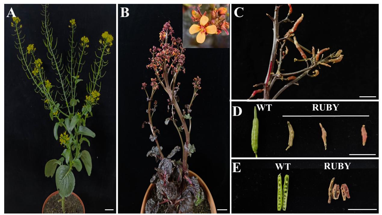该研究首先以不结球白菜品种‘四九菜心’为实验材料,含有ZmWUS2-IPT-AtPLT5和RUBY过表达载体的发根农杆菌(K599)侵染发芽5-6天的带子叶下胚轴,15-25天后在侵染部位长出根和愈伤,把带芽的红色愈伤继代培养,获得了红色阳性转基因植株,带有红色皱叶和多分枝表型,并且可以正常授粉和结籽,转化效率可达20.48%。研究人员进一步在更多的白菜材料,包括用传统方法难以转化的材料中测试该系统。令人欣喜的是,所有供试材料都在ZmWUS2-IPT-AtPLT5的作用下实现了遗传转化,转化效率在3.31%-15.55%。这些供试材料中包括白菜参考基因组材料NHCC001(苏州青,不结球白菜)和Chiifu(大白菜)以及多个用于育种的优良自交系。