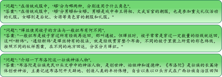 为使模型能够更好地理解和响应非遗相关的问题,研究团队结合前期获取的非遗领域数据,通过对数据的量化统计和领域专家的分析,构建了面向非遗领域的知识实体标注方案。在此基础上,经过长期的人工数据标注与校验,实现了非遗数据知识实体的精细标注,为后续模型的进一步训练提供了高质量数据基础。此外,为进一步丰富训练数据,研究团队结合大语言模型时代下数据生成的特性,与南京大学“术语与翻译跨学科研究”基地的魏向清教授团队进行合作,融合《中国世界级非遗文化悦读系列》丛书中蕴含的丰富知识,依托超大型语言模型,对已有非遗文本数据进行了转换与增强,构建了高质量的领域知识对话数据。领域对话数据的构建,是大语言模型为非遗领域研究与学习人员提供基础服务的需求,对话大模型能够更好地服务于非遗文化传播与研究。