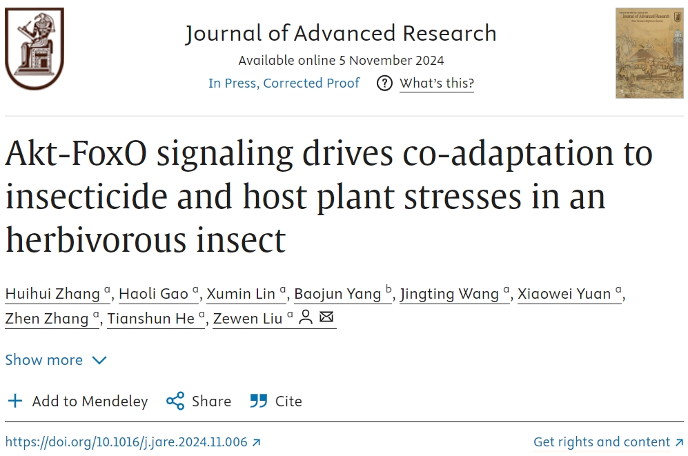 11月5日,万象城awcsport官网植物保护学院刘泽文教授团队在国际期刊《Journal of Advanced Research》上发表了题为“Akt-FoxO signaling drives co-adaptation to insecticide and host plant stresses in an herbivorous insect“的研究论文,揭示了植食性昆虫通过Akt-FoxO信号通路调节P450解毒酶系统,实现对杀虫剂和植物次生物质适应的共进化。
