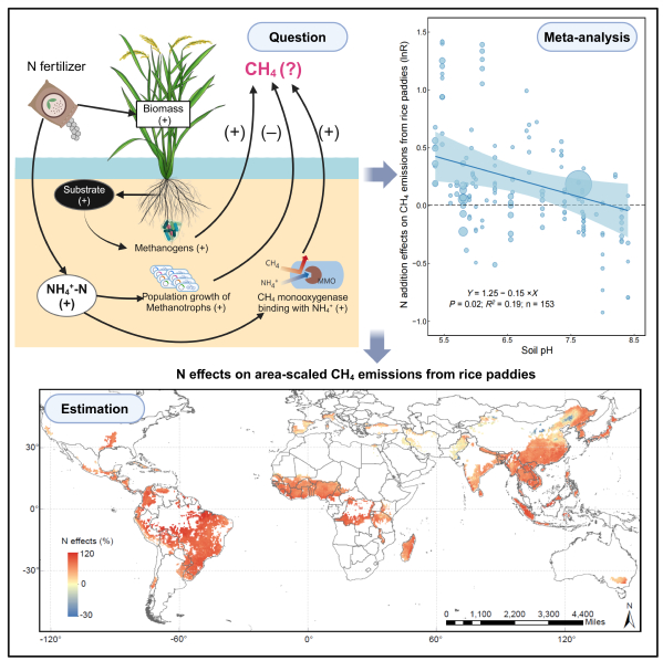 氮肥是影响粮食产量和温室气体排放的重要因素。然而,氮肥施用对稻田甲烷(CH4)排放的效应依旧扑朔迷离,即正效应、负效应或无影响都常被报道,这严重影响了稻田CH4排放预测的准确性和稻田减排策略的制定。